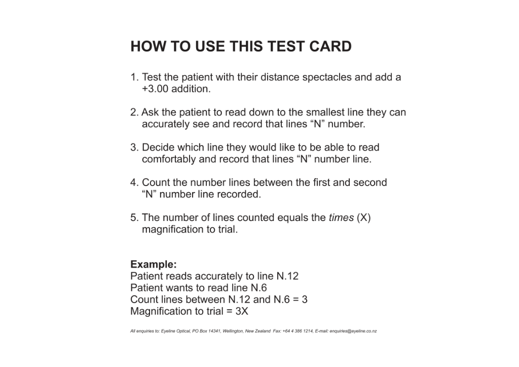 The same method can be used for assessing approximate magnification for LVA use as described in the Veale-AllBlax LogMAR Reading Card.